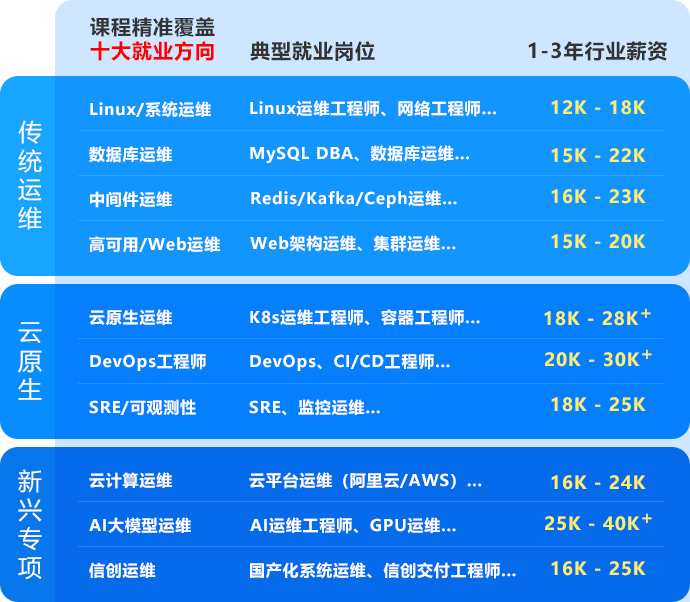 学员将系统掌握运维核心职责、Linux 系统操作与服务管理、云服务器(如阿里云 ECS)使用、大模型部署及博客系统全流程上线等关键技能。